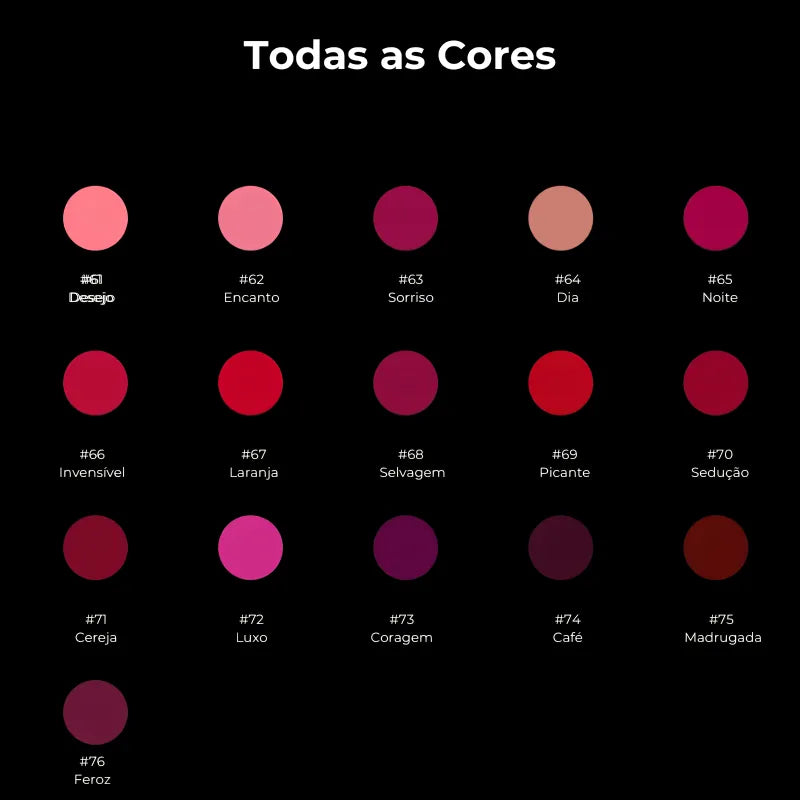 • Acabamento Fosco de Veludo: O batom proporciona um acabamento fosco sofisticado, mantendo a sensação de conforto e proteção nos lábios. Ideal para quem busca um visual moderno e elegante.