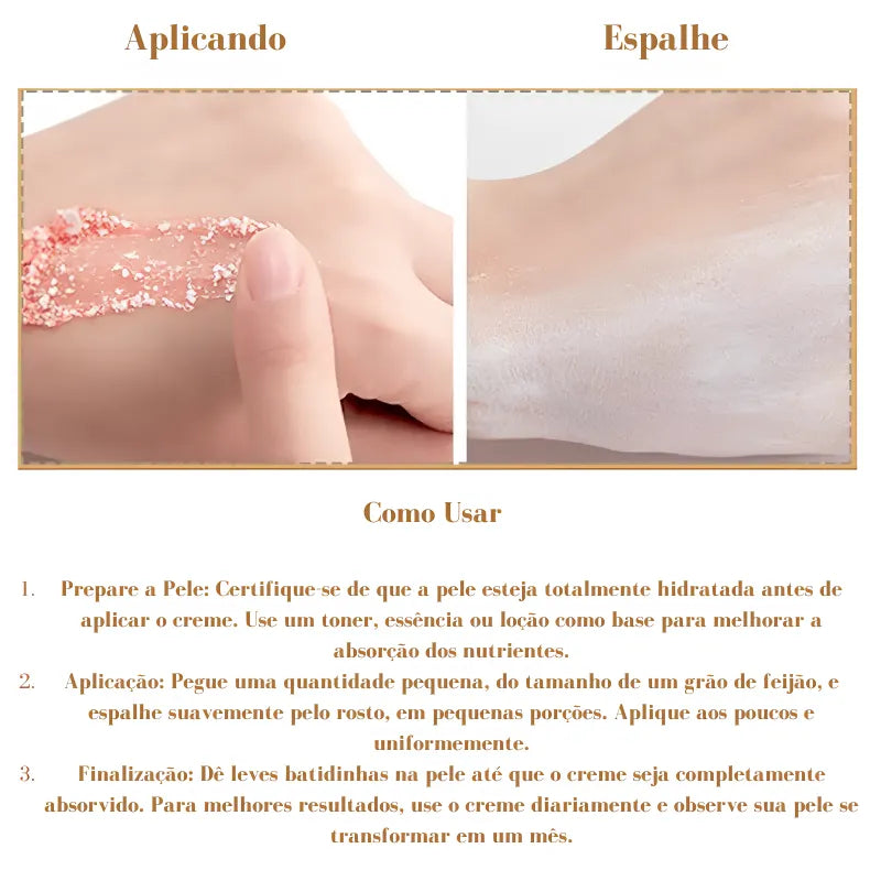 3. Finalização: Dê leves batidinhas na pele até que o creme seja completamente absorvido. Para melhores resultados, use o creme diariamente e observe sua pele se transformar em um mês.