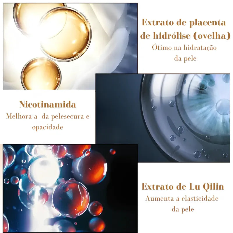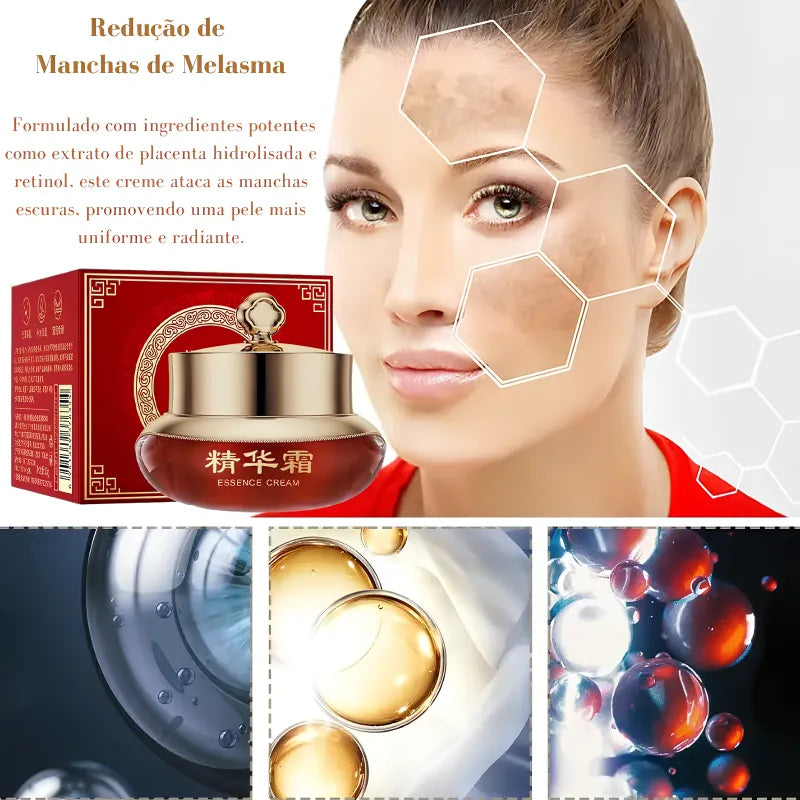 • Redução de Manchas de Melasma: Formulado com ingredientes potentes como extrato de placenta hidrolisado e retinol, este creme ataca as manchas escuras, promovendo uma pele mais uniforme e radiante.